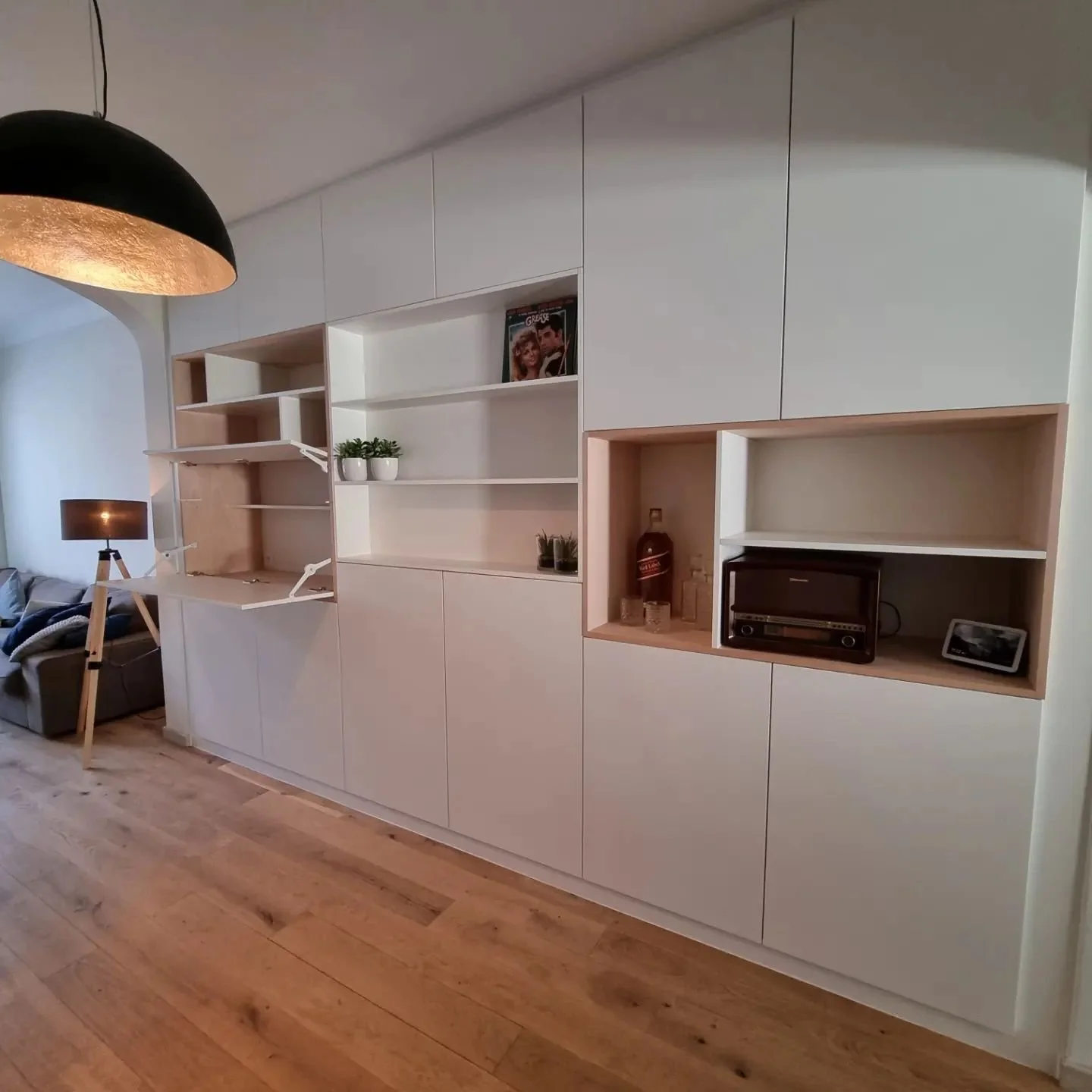 In deze realisatie werd een maatkast gebruikt om de ruimte tussen keuken en zitkamer optimaal benutten. Deze kast met gelakte fronten en lichte beukfineer werd ontworpen naar de wensen van de klant met geïntegreerde barkast.